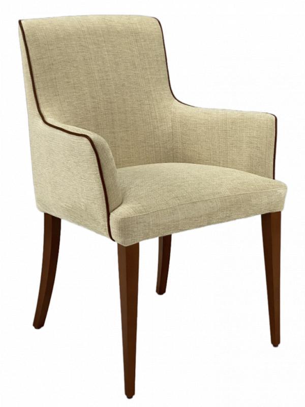 Armstoel Barletta in een mooie beige stof met bruin lederen biezen. De hoogte van de armleuning is 66 cm. vanaf de grond. Deze stof van PielSa is in vijf kleuren leverbaar.