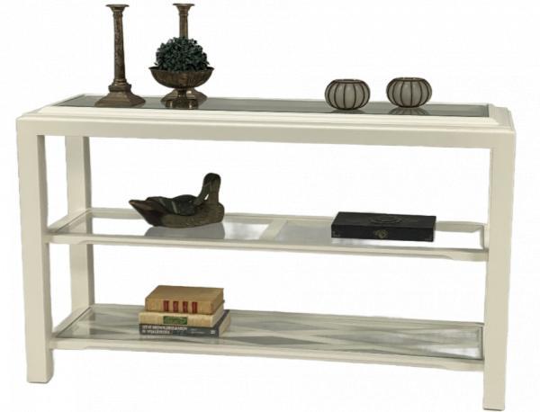 Mooie console in kleur RAL 9010. de bovenst glasplaat is Facet geslepen. De laatste in deze kleur ruimen wij op voor een belachelijke prijs!