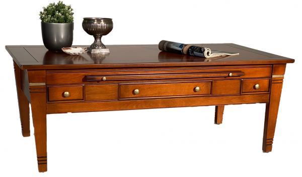 Klassieke salontafel Florence heeft vijf laden waarvan de middelste 'doorschuift' naar beide kanten. Tevens heeft de tafel een handig uittrekblad aan één kant. De tafel is uitgevoerd met mooie messing randjes in de poten. De laatste vier stuks bieden wij aan voor een vriendenprijs!